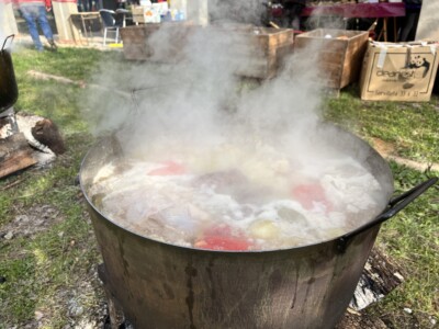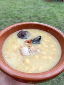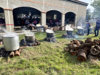 Cuando terminamos la ruta y volvimos al punto de inicio ya estaban repartiendo unas cazuelas del puchero que estaban cocinando en unas marmitas cuando empezamos la ruta. Estaba riquísimo y mi madre empezó a sacar tuppers para que la gente de la organización se los rellenaran, porque total, iba a sobrar de todas formas. Nosotros nos llevamos uno de los tuppers y fue nuestra comida del día siguiente.