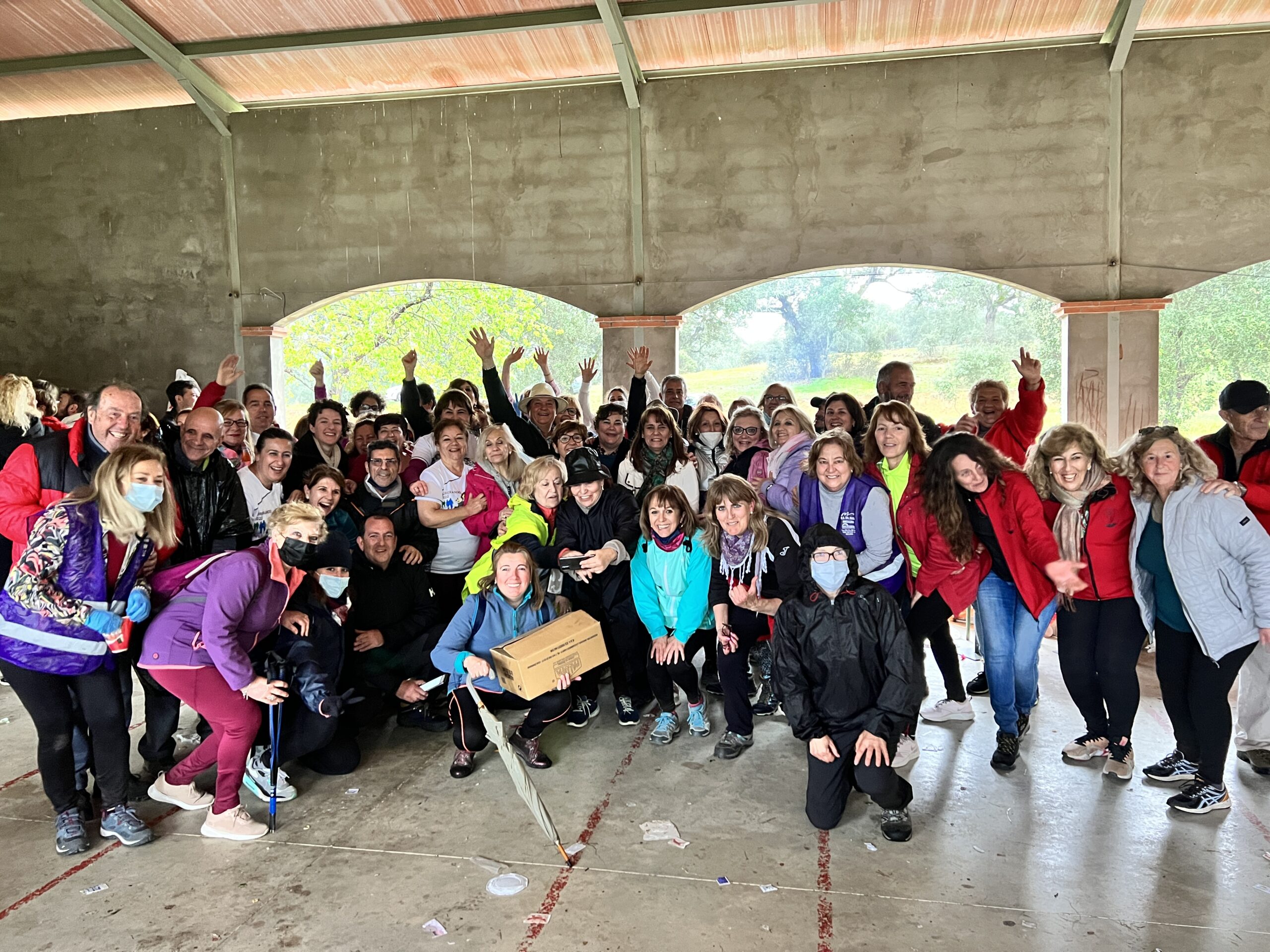 Cuando terminamos de comer empezó a diluviar y nos resguardamos en un edificio que había, donde casi ni se cabía. Allí empezaron a dar el postre-merienda: otra vez pasteles caseros con café y ya poco a poco la gente empezó a irse, dejando más espacio en el edificio, donde empezarón a cantar y bailar, todo orquestado por un dj que tenían contratado.